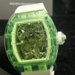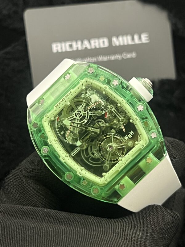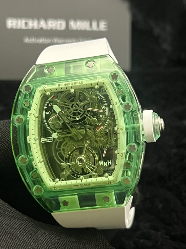 The Richard Mille RM 56-01 Green Sapphire Tourbillon 50 mm is designed for ultimate luxury and innovation. It features a striking full green sapphire case that showcases the movement in a transparent design, a high-precision tourbillon movement representing mechanical excellence, lightweight yet durable construction using advanced materials, a bold and visually stunning statement aesthetic, and exceptional exclusivity for high-end collectors.
