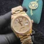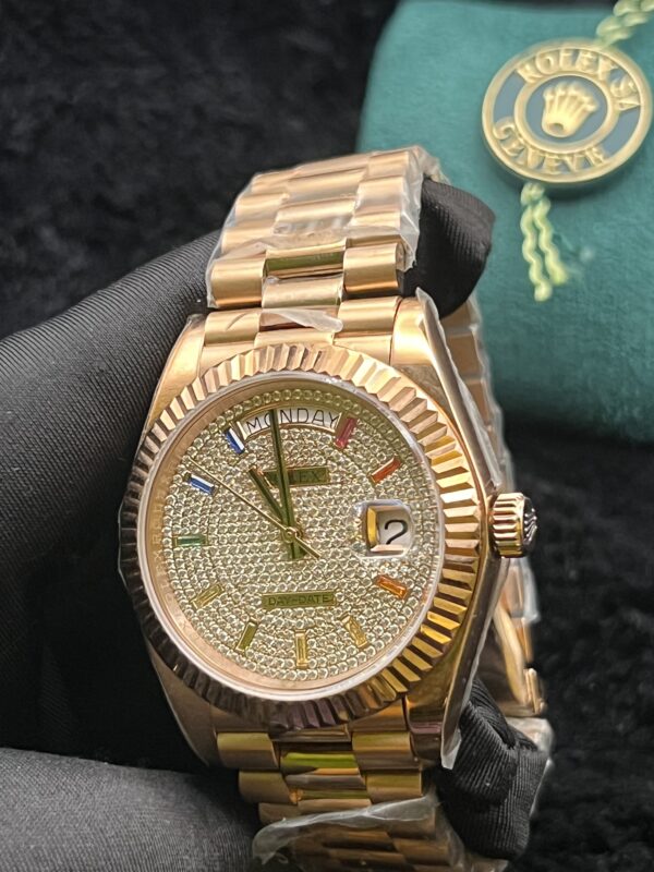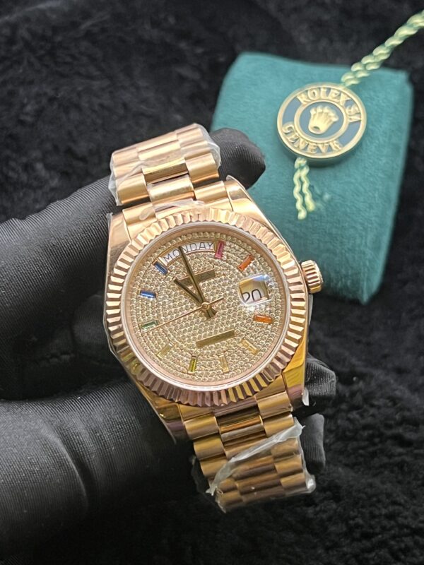 The Rolex Day-Date 40 mm Rose Gold Diamond Paved Dial showcases elegance and superior craftsmanship. It features a warm rose gold case with a premium finish, a dazzling diamond-paved dial that adds brilliance and sophistication, the signature Day-Date display for convenience, a durable and refined construction, and a luxurious statement design perfect for formal occasions and collectors.
